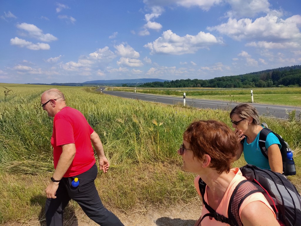 Nun führt der GrimmSteig immer bergan. Erst im matschigen Wald, dann über sehr sonnige Wiesen und schließlich an den Kalkbergen im Wald steilrauf. Die Beine sind schon schwer, aber wir müssen da rauf. Oben behaupte ich, den Ausblick zu genießen. Aber eigentlich möchte ich nur weiter, da ich ja weiß, dass Peter nur wenige Meter entfernt auf dem Wanderparkplatz mit einer Pause mit Verpflegung wartet. Dort genießen wir erst einmal wieder die üppige Verpflegung. Auf Diät ist hier heute keiner. Nur das Eis zum Abschluss findet nicht den großen Anklang. Immerhin sind jetzt schon ca. 45 km geschafft. Ich sage mir immer, das ist mehr als die Hälfte. Aber es dauerte auch eine ganze Zeit, bis alle Teilnehmer am Pausenpunkt eingetroffen waren. Inge war auch einmal falsch abgebogen, dazu war ihr Handyakku lehr, aber mit einem guten Riecher hat Peter sie im Ort gleich gefunden und zurück zum Parkplatz gebracht. Hier hatte sie geplant aufzuhören, daher war alles auch nicht so schlimm. Die beiden Teilnehmer aus dem Ruhrgebiet wurden nun aber zusehends müder und es wurde daher immer schwerer, in einer Gruppe zusammen zu gehen.