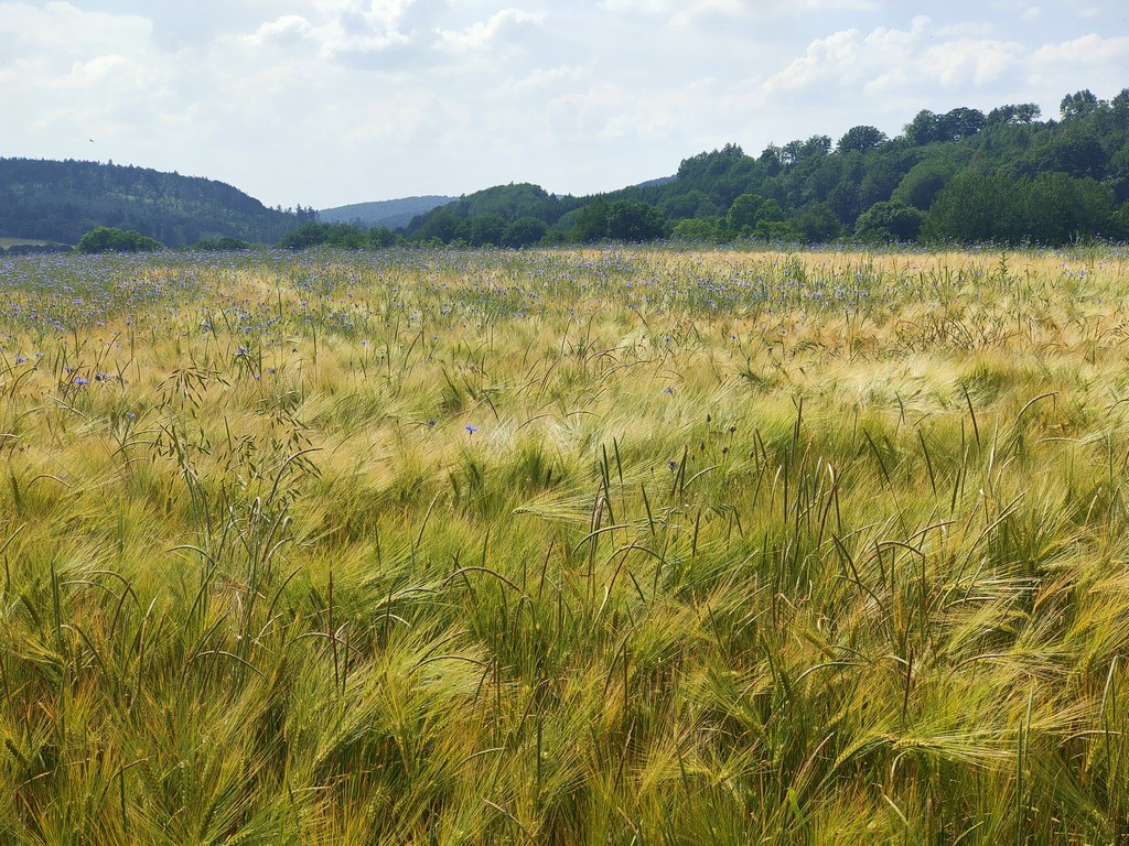 Ab jetzt beginnen die kürzeren Abschnitte. Nur noch denken von Pause zu Pause. Die Füße tragen mich irgendwie dahin. Wir starten am Meißner und beschließen, das Tempo zu mindern. Conny, die uns mit dem leckeren Frühstück verwöhnt hat, steigt nun auch mit ein und beschließt eher am Ende zu gehen. Daher gehe ich auch etwas mehr in der Mitte, um die Schnellen nicht noch zu höherem Tempo zu animieren. Bergab über die Seesteine und die steilen Wiesenpfade geht es sowieso langsamer. Die Sonne steht mittlerweile schon recht hoch und brennt erbarmungslos auf uns und das schöne Seitental herab. Die Felder bieten keinerlei Schatten. Ich freue mich auf Hasselbach und eine kurze Pause am idyllischen Wasserhaus. In Hasselbach kommt auch eine weitere Wanderin hinzu. So wird die Gruppe langsam größer. Am Wasserhaus gibt es eine kleine Quelle. Es ist einfach angenehm, die Hände ins Wasser zu halten und die Pulsadern zu kühlen. Ein bisschen komisch ist es aber, alle Teilnehmer zu beobachten, wie sie sich ungelenk über das Wasser beugen. Nach 40 Kilometern ist eigentlich keiner mehr so richtig gelenkig. Laufen geht, klar. Bücken ist schon etwas schwierig.
