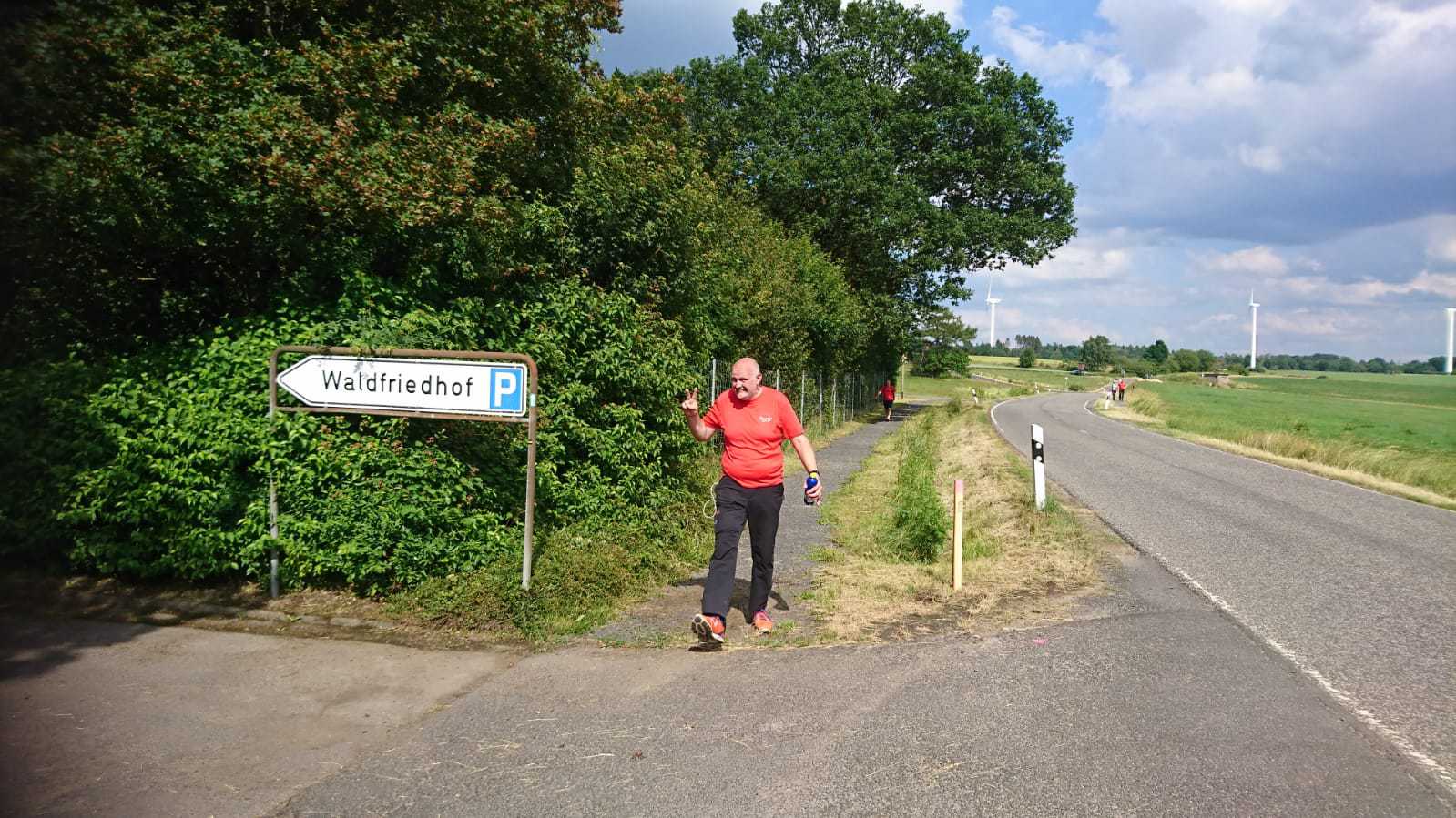 Ob alles gut ist? Na ja, ich fühle mich komplett fertig. Selbst die leckeren Brötchen von Horst wollen nicht mehr rein. Also, bringen wir den Rest noch hinter uns. Aufgeben ist sowieso keine Option!! Auf jeden Fall fühlen sich die Füße besser an, als letztes Jahr. Blasen spüre ich schon, ja, aber es geht schon einigermaßen. Die Schritte über den Friedhof sind schnell gemacht. Nun über den unebenen engen Waldpfad. Jetzt irgendwie wieder in den Schritt kommen. Die Beine tun weh, vor allem die Oberschenkel. War es wirklich gut, es bergab etwas laufen zu lassen? Die Beine sind einfach nur schwer. Und dann sind da auch noch die Brennnesseln. Der Weg ist einfach nur schmal, matschig und zugewachsen. Wir müssen da durch und immer weiter. Runter zu der kleinen Brücke und dann zum Holzteich. Ok, die Sonne brennt, es geht so eben da hin und eigentlich ist es jetzt nur noch ein richtiger Berg. Hinauf auf den Belgerkopf. So trotten wir nebenher… .  Schritt für Schritt kämpfen wir uns hoch. es ist auch nicht wirklich anstrengender, bergauf zu gehen. Jeder Schritt ist einfach nur anstrengend. Oben geht es wieder durch enges Gestrüpp und auch einmal über einen Baumstumpf klettern. Wieder runter und doch wieder steil hinauf. Jetzt ist es geschafft. Kurze Trinkpause. Und nun runter. Der lange Abstieg ins Lossetal. 300 Höhenmeter. Normal ist das recht angenehm, heute nicht. Die Oberschenkel melden sich permanent zu Wort. Natürlich, aufgeben ist keine Option und steht überhaupt nicht zur Debatte. Es geht auch noch, aber genießen kann man das nicht nennen. Wir überlegen, ob es sinnvoll wäre, im Tresor schnell ein Bierchen zu zischen. Sehr verlockend. Es würde auf dem Weg zum Magen geradezu verdampfen. Lecker! Es ist ein guter Gedanke, er motiviert. Das nächste Etappenziel ist die Dillinghütte. Dort werden wir eine kleine Trinkpause machen. Und auch hinsetzen. Ich entspanne dann immer stark meinen Rücken. Erstmal „Katzenbuckel“ und die Lendenwirbelsäule etwas dehnen. Das ist richtig angenehm. und es geht wieder weiter. Conny kommt uns mit einem Strahlen entgegen. Sie wird uns die letzten Meter bis zur Königs-Alm begleiten. Letzten Meter ist etwas übertrieben, es sind noch gut 5 Kilometer, also umgerechnet 1 Stunde. Im Moment fühlt sich das wie eine ganze Ewigkeit an. Eine Stunde sollen wir noch laufen. Gefühlt sind wir doch schon da. Durch Kaufungen geht es nun immer weiter, Schritt für Schritt. Wir sehen den Tresor. Jetzt ein Bier? Nein, die Vernunft siegt! Natürlich. Jede Pause macht den Weg im Prinzip noch länger und das tolle Abschlussbier muss noch länger warten. Nein, wir gehen weiter! Über den Bahnhof geht es schließlich wieder rauf. Wieder einmal bergauf. Aber es ist gar nicht so schlimm. Bergaufgehen ist schon anstrengend, aber es geht schon. Jetzt in der Sonne am Mitteltalhof vorbei. Auch hier wird gefeiert und auch Bier getrunken. Nein, wir gehen durch. Erst etwas steiler, und dann immer flacher, langsam kommt der Parkplatz in Sicht. Und es ist dann auch gar nicht so schlimm. Wir gehen gleich weiter zur Königs-Alm. Setzen ist das nächste Ziel, eine Maß bestellen und einfach nur Ankommen!