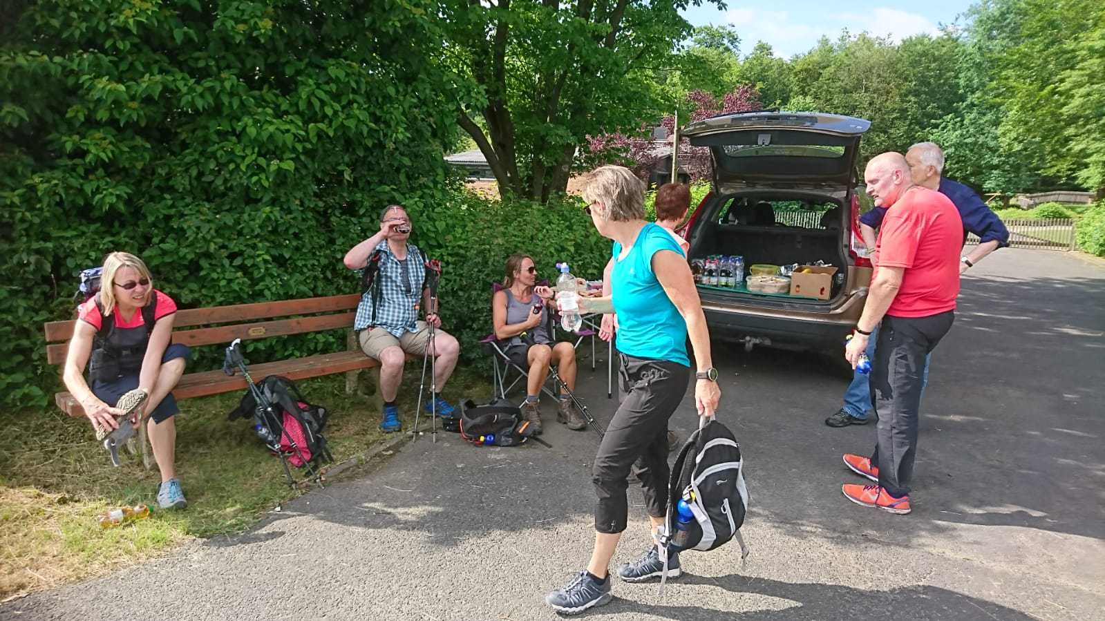 Ob alles gut ist? Na ja, ich fühle mich komplett fertig. Selbst die leckeren Brötchen von Horst wollen nicht mehr rein. Also, bringen wir den Rest noch hinter uns. Aufgeben ist sowieso keine Option!! Auf jeden Fall fühlen sich die Füße besser an, als letztes Jahr. Blasen spüre ich schon, ja, aber es geht schon einigermaßen. Die Schritte über den Friedhof sind schnell gemacht. Nun über den unebenen engen Waldpfad. Jetzt irgendwie wieder in den Schritt kommen. Die Beine tun weh, vor allem die Oberschenkel. War es wirklich gut, es bergab etwas laufen zu lassen? Die Beine sind einfach nur schwer. Und dann sind da auch noch die Brennnesseln. Der Weg ist einfach nur schmal, matschig und zugewachsen. Wir müssen da durch und immer weiter. Runter zu der kleinen Brücke und dann zum Holzteich. Ok, die Sonne brennt, es geht so eben da hin und eigentlich ist es jetzt nur noch ein richtiger Berg. Hinauf auf den Belgerkopf. So trotten wir nebenher… .  Schritt für Schritt kämpfen wir uns hoch. es ist auch nicht wirklich anstrengender, bergauf zu gehen. Jeder Schritt ist einfach nur anstrengend. Oben geht es wieder durch enges Gestrüpp und auch einmal über einen Baumstumpf klettern. Wieder runter und doch wieder steil hinauf. Jetzt ist es geschafft. Kurze Trinkpause. Und nun runter. Der lange Abstieg ins Lossetal. 300 Höhenmeter. Normal ist das recht angenehm, heute nicht. Die Oberschenkel melden sich permanent zu Wort. Natürlich, aufgeben ist keine Option und steht überhaupt nicht zur Debatte. Es geht auch noch, aber genießen kann man das nicht nennen. Wir überlegen, ob es sinnvoll wäre, im Tresor schnell ein Bierchen zu zischen. Sehr verlockend. Es würde auf dem Weg zum Magen geradezu verdampfen. Lecker! Es ist ein guter Gedanke, er motiviert. Das nächste Etappenziel ist die Dillinghütte. Dort werden wir eine kleine Trinkpause machen. Und auch hinsetzen. Ich entspanne dann immer stark meinen Rücken. Erstmal „Katzenbuckel“ und die Lendenwirbelsäule etwas dehnen. Das ist richtig angenehm. und es geht wieder weiter. Conny kommt uns mit einem Strahlen entgegen. Sie wird uns die letzten Meter bis zur Königs-Alm begleiten. Letzten Meter ist etwas übertrieben, es sind noch gut 5 Kilometer, also umgerechnet 1 Stunde. Im Moment fühlt sich das wie eine ganze Ewigkeit an. Eine Stunde sollen wir noch laufen. Gefühlt sind wir doch schon da. Durch Kaufungen geht es nun immer weiter, Schritt für Schritt. Wir sehen den Tresor. Jetzt ein Bier? Nein, die Vernunft siegt! Natürlich. Jede Pause macht den Weg im Prinzip noch länger und das tolle Abschlussbier muss noch länger warten. Nein, wir gehen weiter! Über den Bahnhof geht es schließlich wieder rauf. Wieder einmal bergauf. Aber es ist gar nicht so schlimm. Bergaufgehen ist schon anstrengend, aber es geht schon. Jetzt in der Sonne am Mitteltalhof vorbei. Auch hier wird gefeiert und auch Bier getrunken. Nein, wir gehen durch. Erst etwas steiler, und dann immer flacher, langsam kommt der Parkplatz in Sicht. Und es ist dann auch gar nicht so schlimm. Wir gehen gleich weiter zur Königs-Alm. Setzen ist das nächste Ziel, eine Maß bestellen und einfach nur Ankommen!
